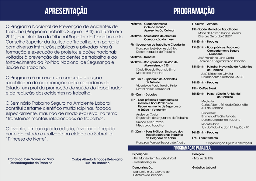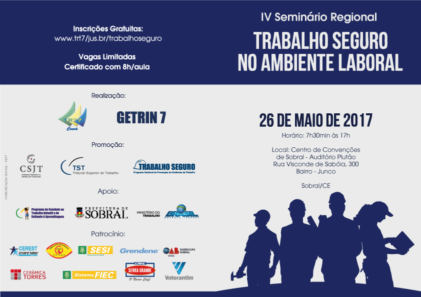As inscrições para o 4º Seminário Regional Trabalho Seguro no Ambiente Laboral são gratuitas e limitadas. Elas só podem ser feitas pelo site do evento (www.trt7.jus.br/