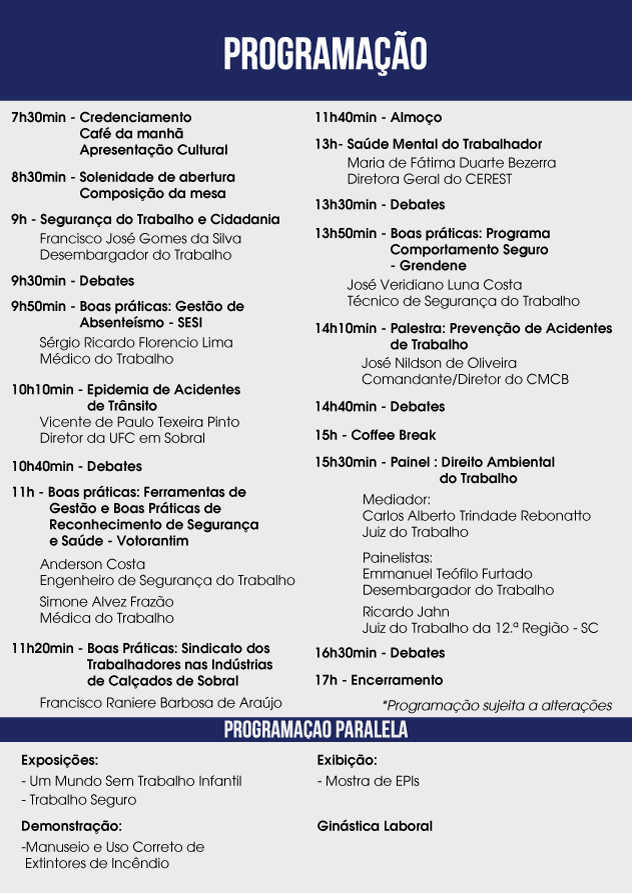Programação, exposições e atividades - No evento também serão debatidos temas como segurança do trabalho e cidadania, direito ambiental do trabalho e epidemia de acidentes de trânsitos. Além das palestras, empresas e entidades apresentarão boas práticas resultantes de experiências ligadas à saúde e segurança do trabalho.