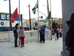 A desembargadora Laís Rossas Freire, a sua chefe de gabinete, Naíla Maria Freire Santos, e a diretora da Divisão de Arquivo do TRT/CE, Maria D'Assunção Xavier Oliveira, foram as convidadas para a solenidade de hasteamento do Pavilhão Nacional e das bandeiras do Ceará e do Tribunal Regional do Trabalho do Ceará - 7ª Região, no Fórum Autran Nunes, na manhã desta segunda-feira, dia 26 de outubro, às 7h h30min, na entrada principal do Edifício Dom Hélder Câmara.