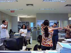 Durante quinze minutos, fisioterapeutas e educadores físicos estão orientando, no próprio local de trabalho, três vezes por semana, várias modalidades de exercícios.