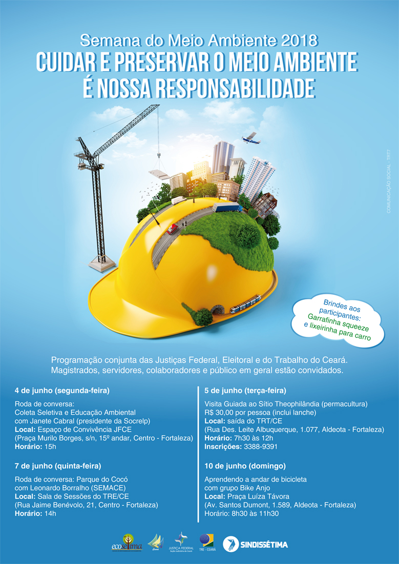 Para marcar o Dia Mundial do Meio Ambiente, comemorado em 5 de junho, o Núcleo de Responsabilidade Socioambiental do Tribunal Regional do Trabalho do Ceará (Ecosétima), em parceria com as Justiças Federal e Eleitoral, preparou uma programação especial. A Semana do Meio Ambiente acontece de 4 a 10 de junho e contará com rodas de conversa, visitação a sítio sustentável e vivência de aprendizagem em bicicleta. Este é o terceiro ano em que os três órgãos do Poder Judiciário Federal realizam o evento.