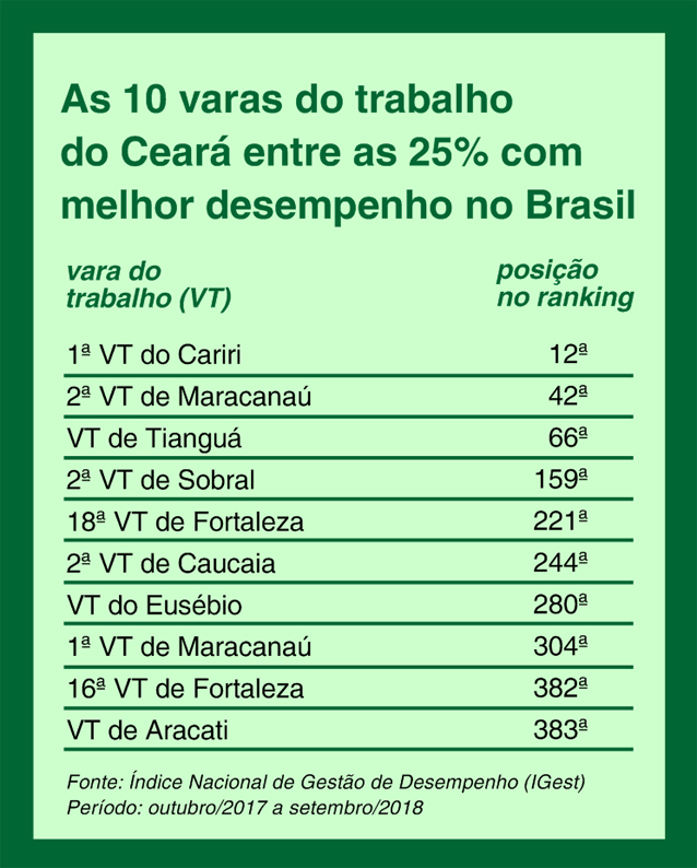 Além da unidade do Cariri, completam a lista das dez varas do trabalho do Ceará entre as 25% com melhor desempenho no Brasil a 2ª VT de Maracanaú (42ª), a VT de Tianguá (66ª), a 2ª VT de Sobral (159ª), a 18ª VT de Fortaleza (221ª), a 2ª VT de Caucaia (244ª), a VT do Eusébio (280ª), a 1ª VT de Maracanaú (304ª), a 16ª VT de Fortaleza (382ª) e a VT de Aracati (383ª).