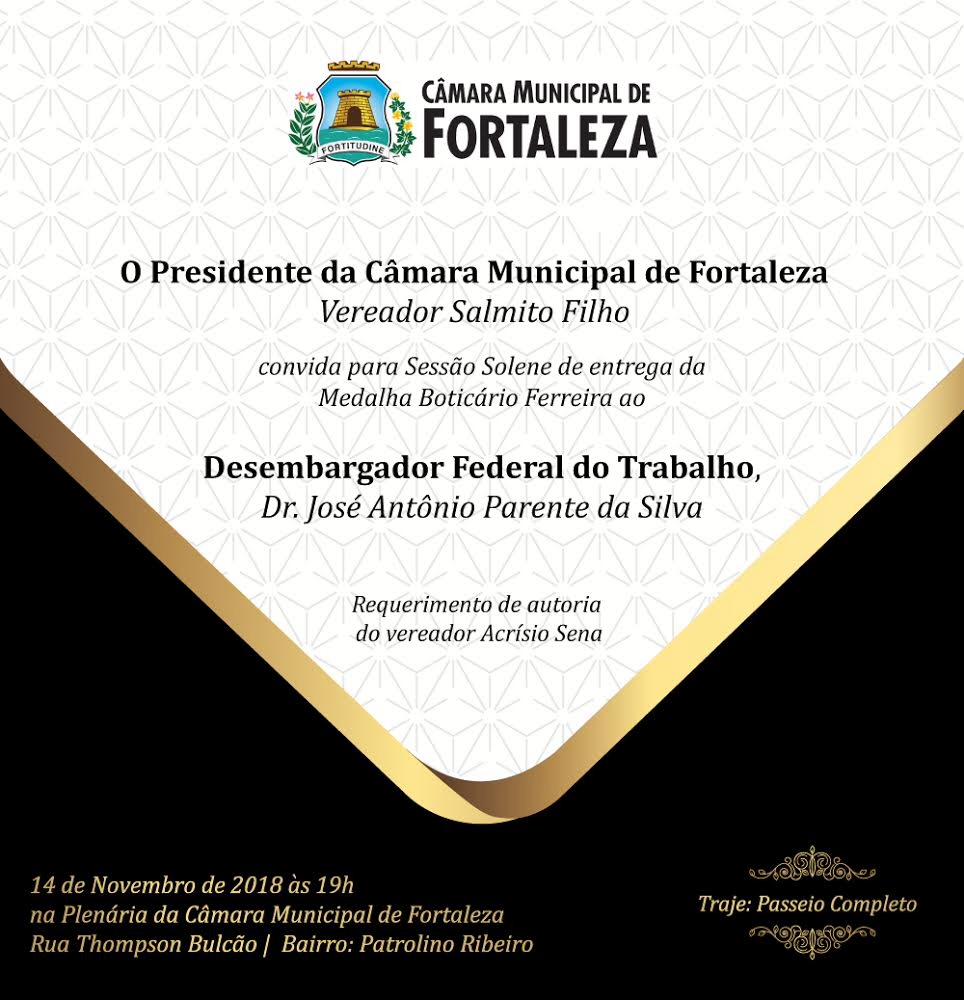 O desembargador José Antonio Parente da Silva, do Tribunal Regional do Trabalho do Ceará, será homenageado pela Câmera Municipal de Fortaleza, nesta quarta-feira (14/11), em sessão solene, às 19h. O magistrado receberá a Medalha Boticário Ferreira, distinção outorgada a personalidades que prestaram serviços de excepcional relevância ao povo de Fortaleza. O requerimento da homenagem é de autoria do vereador Acrísio Sena.
