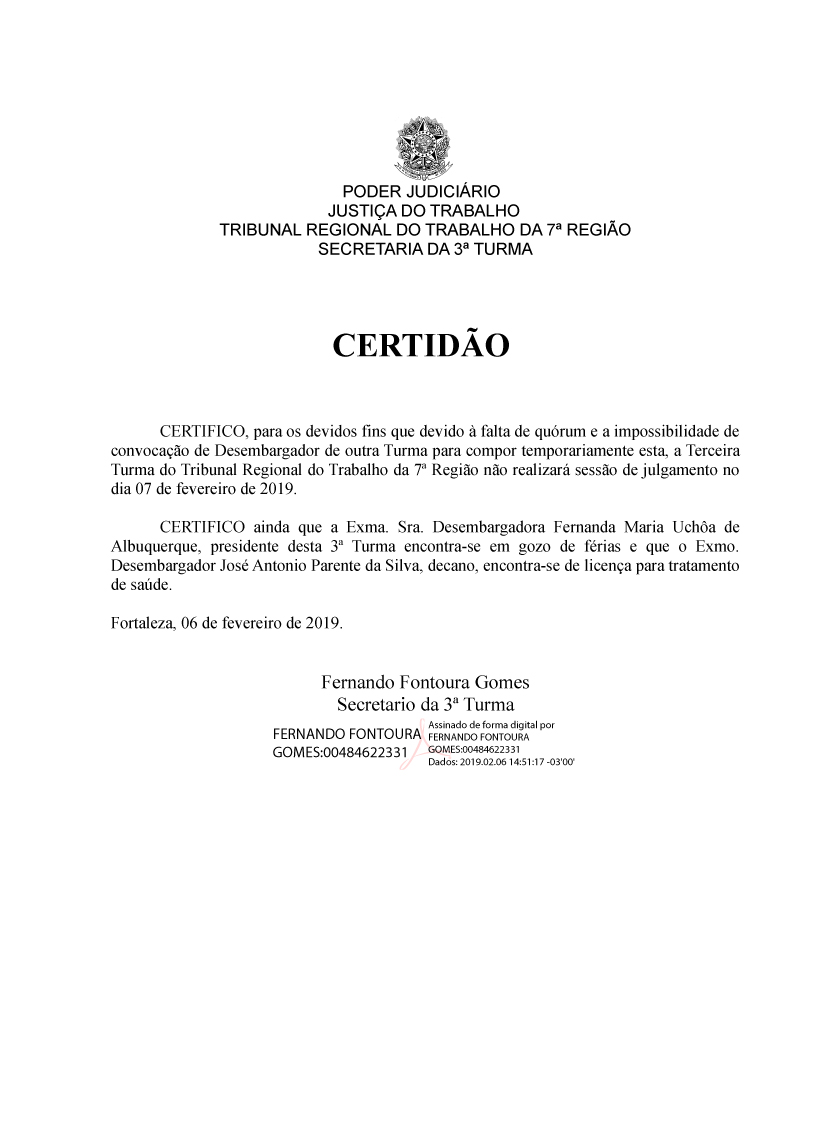 A Terceira Turma do TRT/CE não realizará sessão de julgamento nesta quinta-feira (7/2), conforme certidão ao lado. Segundo o documento, não há quórum necessário para a realização da sessão.
