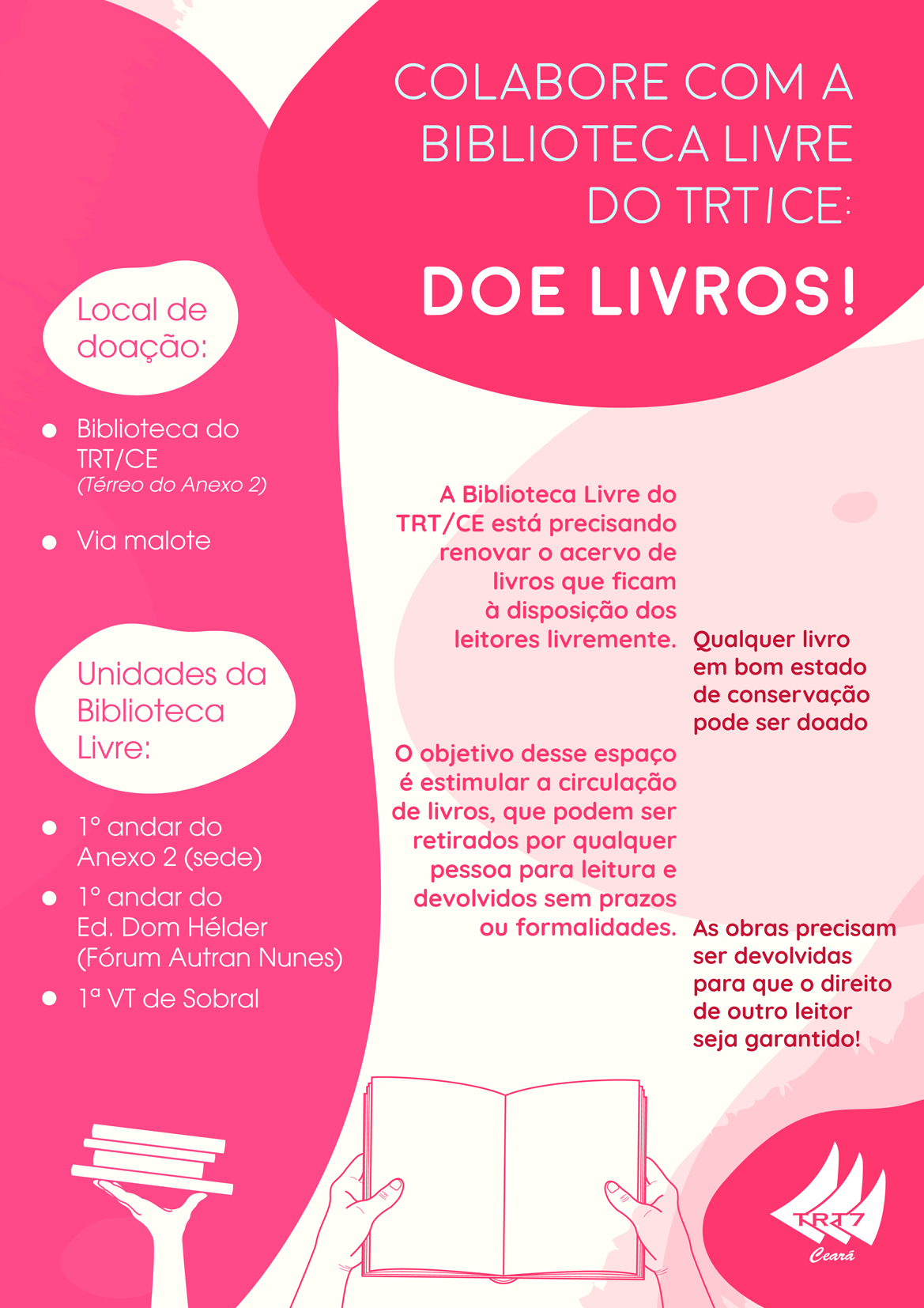 Campanha da Justiça do Trabalho do Ceará busca arrecadar livros para integrar as Bibliotecas Livres do TRT/CE (Anexo 2 - 1º andar) e do Fórum Autran Nunes (1º andar do prédio Dom Hélder Câmara), ambas em Fortaleza, e a unidade na 1º Vara do Trabalho de Sobral. O mote da ação é incentivar a doação de obras literárias pelos magistrados, servidores, terceirizados, estagiários do Regional e público em geral a esses espaços, que prospera o compartilhamento de títulos e o estímulo à leitura.