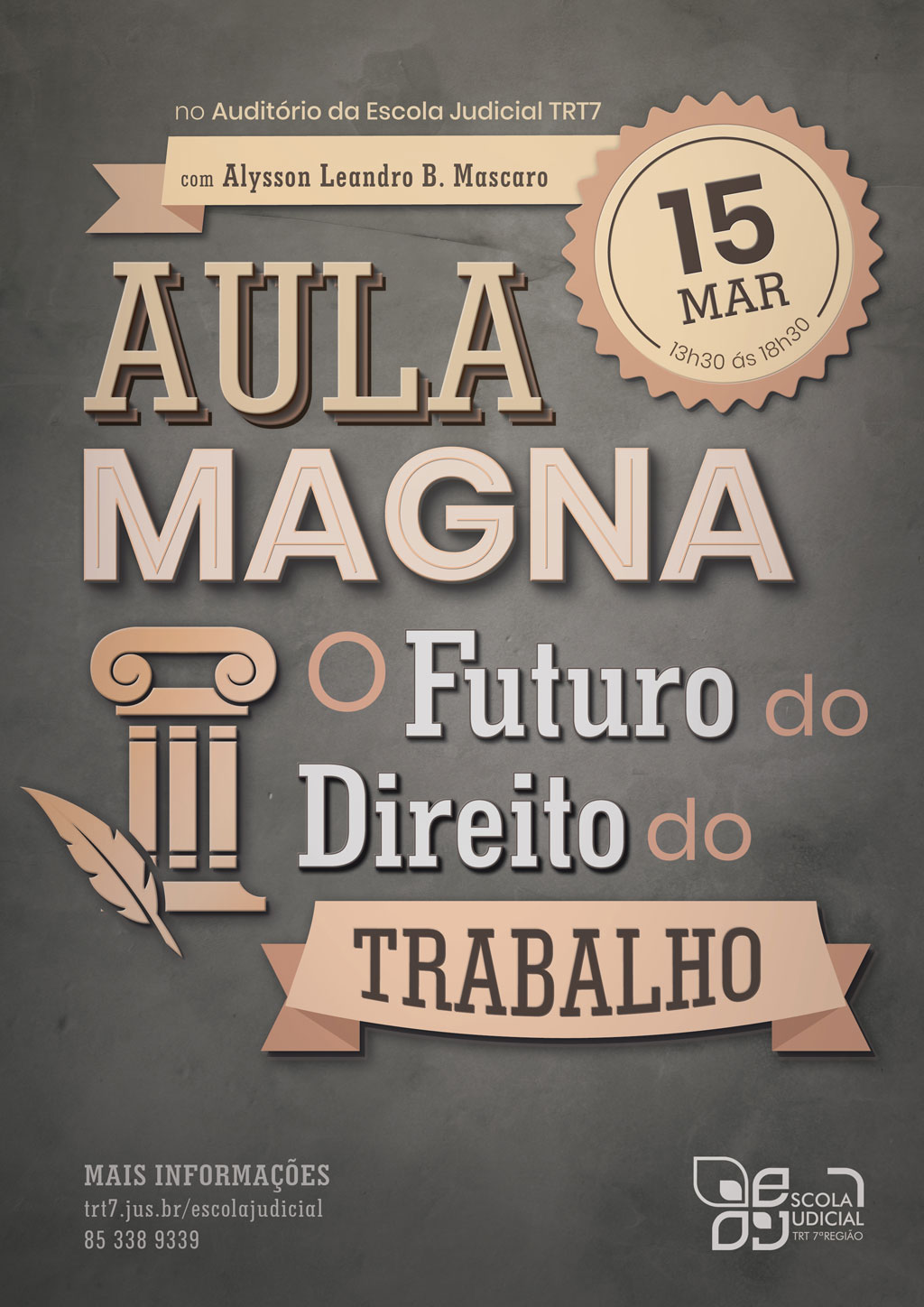 O Tribunal Regional do Trabalho do Ceará, por meio da Escola Judicial, abre inscrições para a "Aula Magna: O Futuro do Direito do Trabalho", que será ministrada pelo advogado e professor Alysson Mascaro, no dia 15 de março (sexta-feira), das 13h30 às 18h30, no auditório do 4º andar - Anexo 2. Faça sua inscrição aqui.