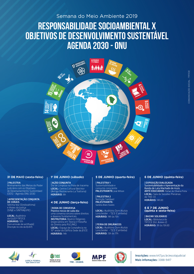 No dia 4 de junho, a Justiça Federal irá realizar uma roda de conversa sobre o tema “Plástico nosso de cada dia: uma conversa sincera sobre direitos e deveres fundamentais.” Já o Tribunal de Justiça promove, no dia 5 de junho, palestras sobre sustentabilidade e consumo consciente e também sobre nutrição. Para encerrar a Semana, no dia 6 de junho, a Justiça Eleitoral programou uma exposição dialogada sobre sustentabilidade. Veja a programação completa no site do TRT/CE.