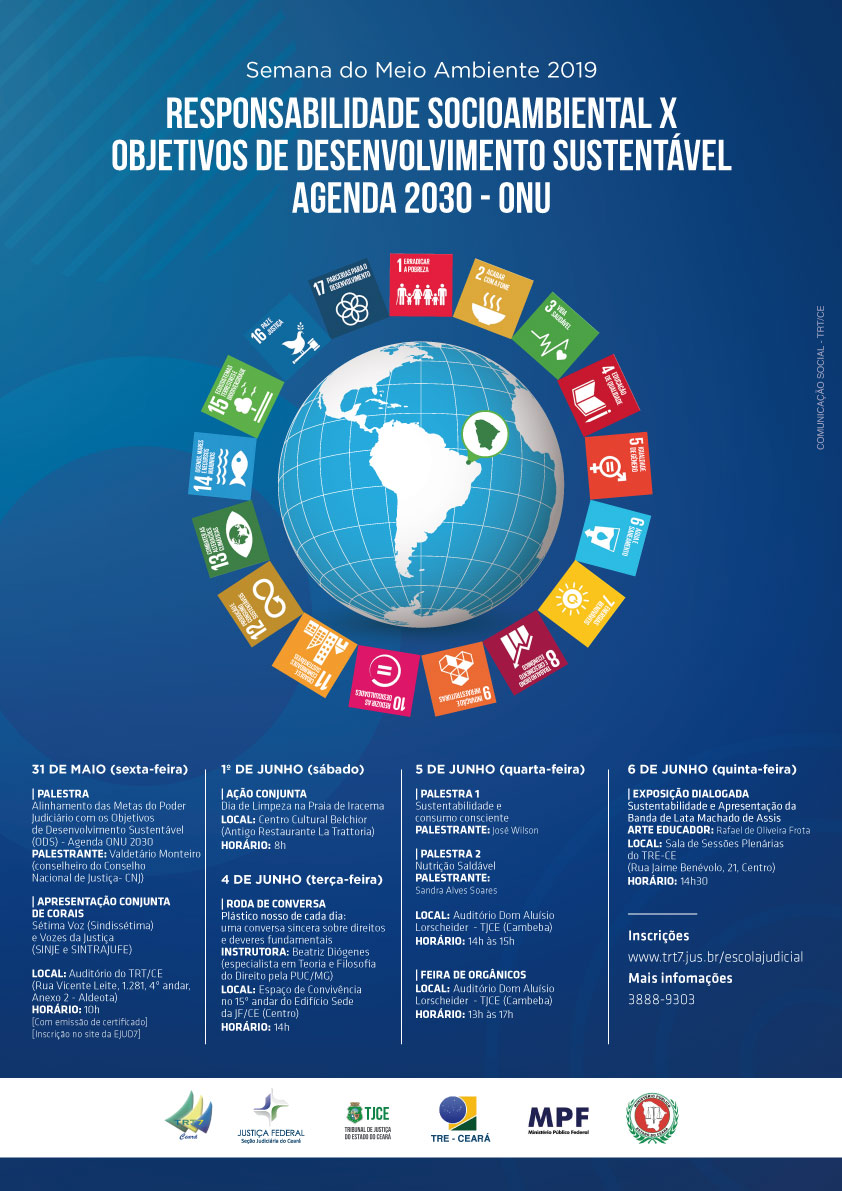 No dia 4 de junho, a Justiça Federal irá realizar uma roda de conversa sobre o tema “Plástico nosso de cada dia: uma conversa sincera sobre direitos e deveres fundamentais”. Já o Tribunal de Justiça promove, no dia 5 de junho, palestras sobre sustentabilidade e consumo consciente e também sobre nutrição. Para encerrar a Semana, no dia 6 de junho, a Justiça Eleitoral programou uma exposição dialogada sobre sustentabilidade. Veja a programação completa no site do TRT/CE.