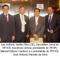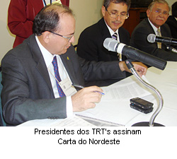 Numa iniciativa pioneira entre os Tribunais Regionais da região Nordeste, foi assinada hoje, na cidade de Fortaleza-CE, a primeira Carta onde estão condensadas e socializadas as boas práticas administrativas e judiciais na busca pela excelência na administração da Justiça do Trabalho. Estavam presentes no Encontro de TRTs NE os desembargadores presidentes dos TRTs: José Antônio Parente da Silva – 7ª região, Edvaldo de Andrade - 13ª região, Márcia Andréia Farias da Silva - 16ª região, Maria das Graças Monteiro Melo - 20ª região, José Barbosa Filho - 21ª região e Manoel Edílson Cardoso - 22ª região.