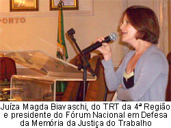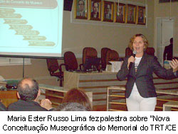 Em seguida, a responsável pelo Memorial do TRT/CE, Maria Ester Russo Lima, proferiu palestra sobre a “Nova Conceituação Museográfica do Memorial do TRT” e as ações programadas pelo setor durante todo o ano de 2009 para, na seqüência, convidar a juíza aposentada Magda Biavaschi, do TRT da 4ª Região e presidente do Fórum Nacional em Defesa da Memória da Justiça do Trabalho, para falar sobre a “Memória e Preservação de Documentos: Direitos do cidadão”, encerrando as atividades do primeiro dia de atividades.