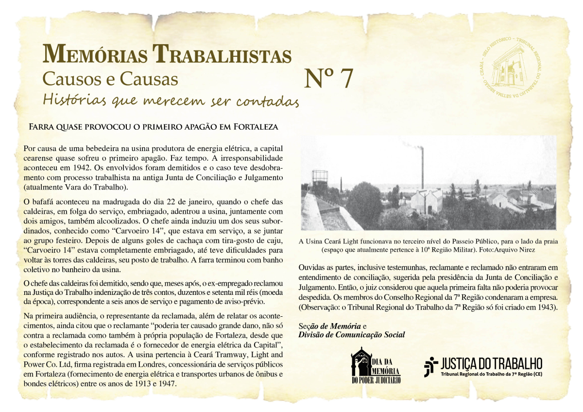 Por causa de uma bebedeira na usina produtora de energia elétrica, a capital cearense quase sofreu o primeiro apagão. Faz tempo. A irresponsabilidade aconteceu em 1942. Os envolvidos foram demitidos e o caso teve desdobramento com processo trabalhista na antiga Junta de Conciliação e Julgamento (atualmente Vara do Trabalho).