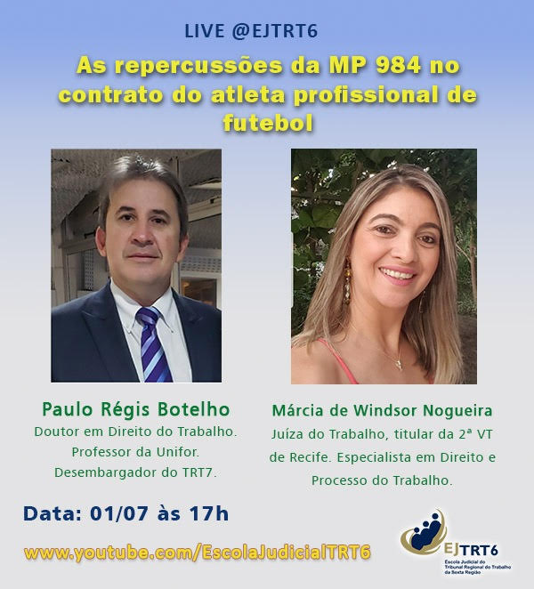 A Escola Judicial do TRT da 6ª Região (Ejud6 - PE) promove a live com o tema "As repercussões da MP 984 no contrato do atleta profissional de futebol”, nesta quarta-feira (1º/7), às 17h. O desembargador do TRT/CE Paulo Régis Botelho é um dos palestrantes. Haverá certificação de participação para magistrados, servidores ou estagiários da Justiça do Trabalho. O evento será transmitido pelo canal do Ejud6 no Youtube.