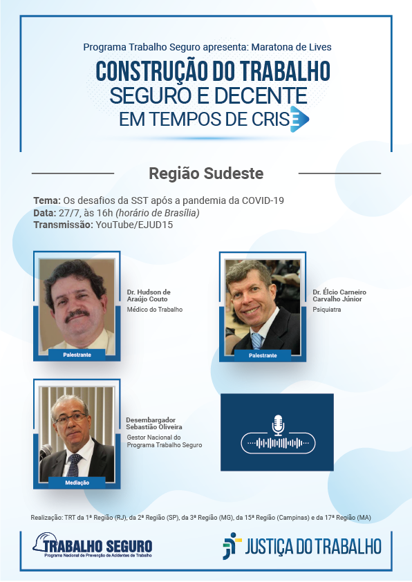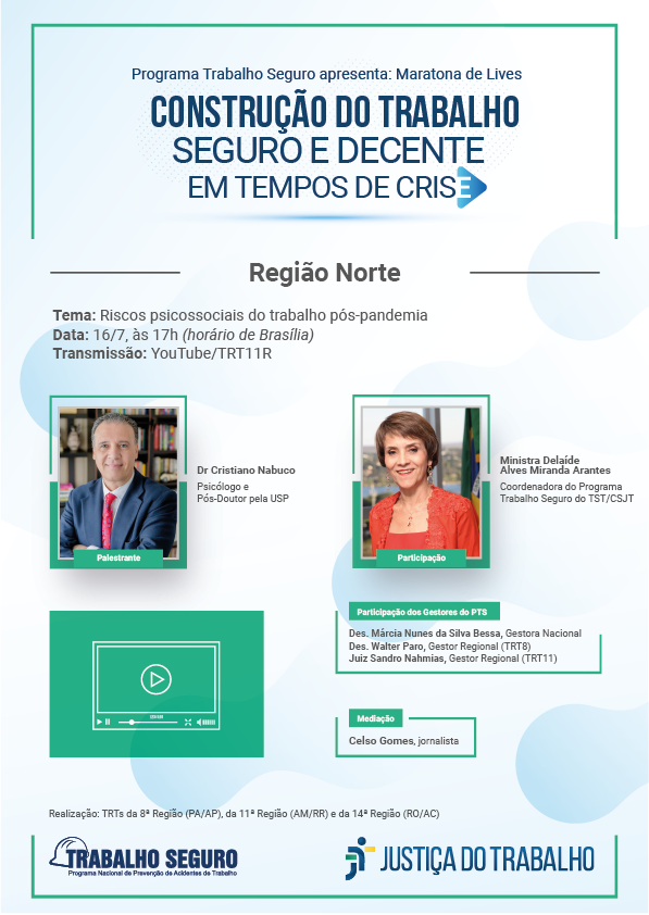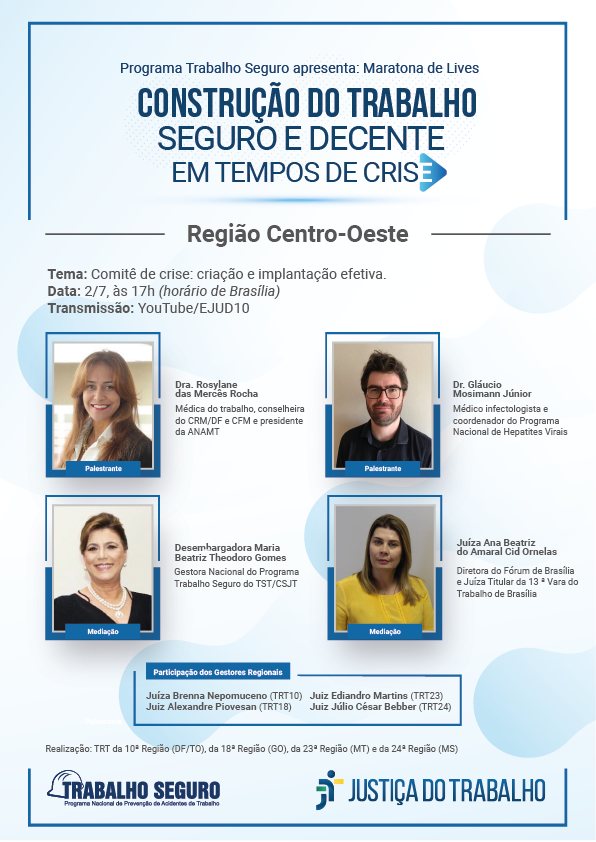 Em agosto, também está previsto um webinário (seminário on-line), que será promovido pelo Tribunal Superior do Trabalho sobre saúde e segurança no trabalho. Confira, a seguir, o tema e o horário de cada transmissão: