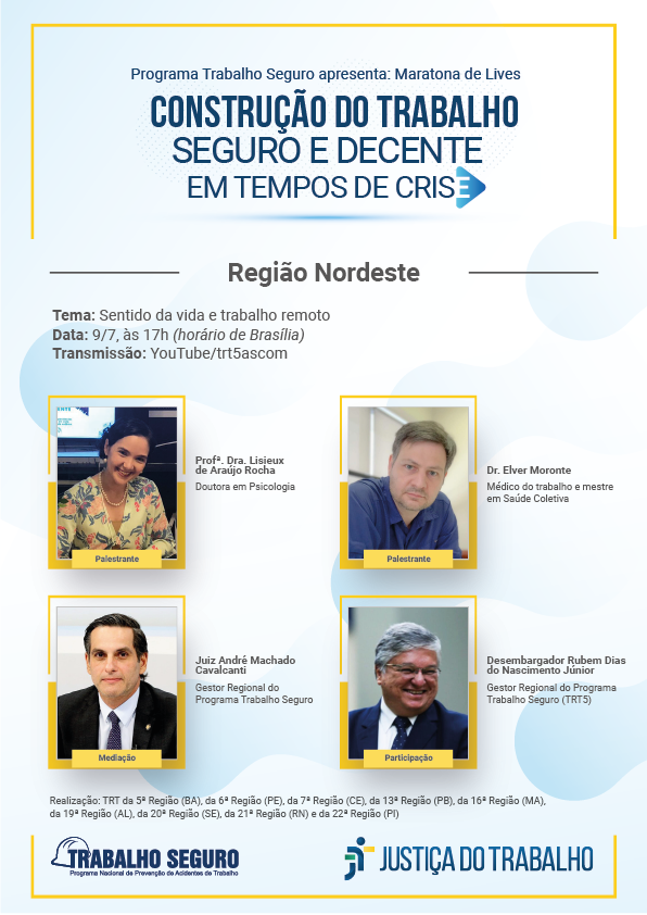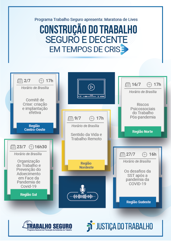 O Programa Nacional de Prevenção de Acidentes de Trabalho (Programa Trabalho Seguro) da Justiça do Trabalho vai realizar, no mês de julho, uma maratona de transmissões ao vivo pela internet com o tema “Construção do trabalho seguro e decente em tempos de crise”. O objetivo da ação é marcar o Dia da Prevenção de Acidentes do Trabalho (27 de julho) e conscientizar a sociedade sobre a importância da saúde laboral em tempos de pandemia.