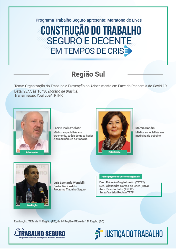 “O Programa Trabalho Seguro (PTS) está sempre atento ao que acontece no mundo do trabalho. Este ano não seria diferente. Em razão do momento ímpar em que vivemos, o Programa segue ativo, buscando alternativas ao alcance do trabalhador. Durante as lives, falaremos sobre a prevenção, sobre a saúde mental do trabalhador, sobre os cuidados com o trabalho remoto e sobre os riscos no pós-pandemia”, explicou a ministra.