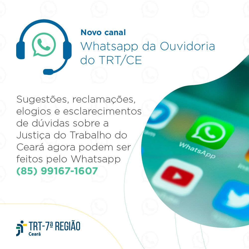 Desde 24 de junho, a Ouvidoria do TRT/CE realiza atendimento pelo aplicativo Whatsapp. Através do número (85) 99167-1607, os públicos externo e interno podem tirar dúvidas, elogiar, sugerir ou reclamar de serviços administrativos ou judiciários da Justiça do Trabalho do Ceará.
