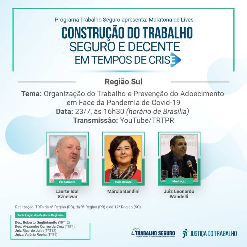 Os Tribunais Regionais do Trabalho da Região Sul promovem nesta quinta-feira (23/7), às 16h30, a live "Organização do trabalho e prevenção do adoecimento em face da pandemia de covid-19", com transmissão pelo canal do TRT da 9ª Região (PR) no Youtube. Com mediação do juiz Leonardo Wandelli, gestor nacional do Programa Trabalho Seguro, a palestra será proferida por Laerte Idal Sznelwar, médico especialista em ergonomia, saúde do trabalhador e psicodinâmica do trabalho e professor da Poliusp, e por Márcia Bandini, médica do trabalho e professora da Unicamp.