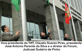 Diante de uma platéia formada por magistrados, diretores, advogados e servidores, e acompanhado do vice-presidente do TRT/CE, desembargador Cláudio Soares Pires, o presidente participou da solenidade de hasteamento do Pavilhão Nacional e das bandeiras do Ceará e do Tribunal Regional do Trabalho, que foi feita, respectivamente, pelos desembargadores José Antonio Parente e Cláudio Soares Pires e pelo juiz Judicael Sudário de Pinho, diretor do Fórum Trabalhista e titular da 1ª Vara do Trabalho de Fortaleza. O Hino Nacional Brasileiro foi apresentado pelo Coral Sétima Voz, formado por servidores do Tribunal e mantido pelo SINDISSÉTIMA.