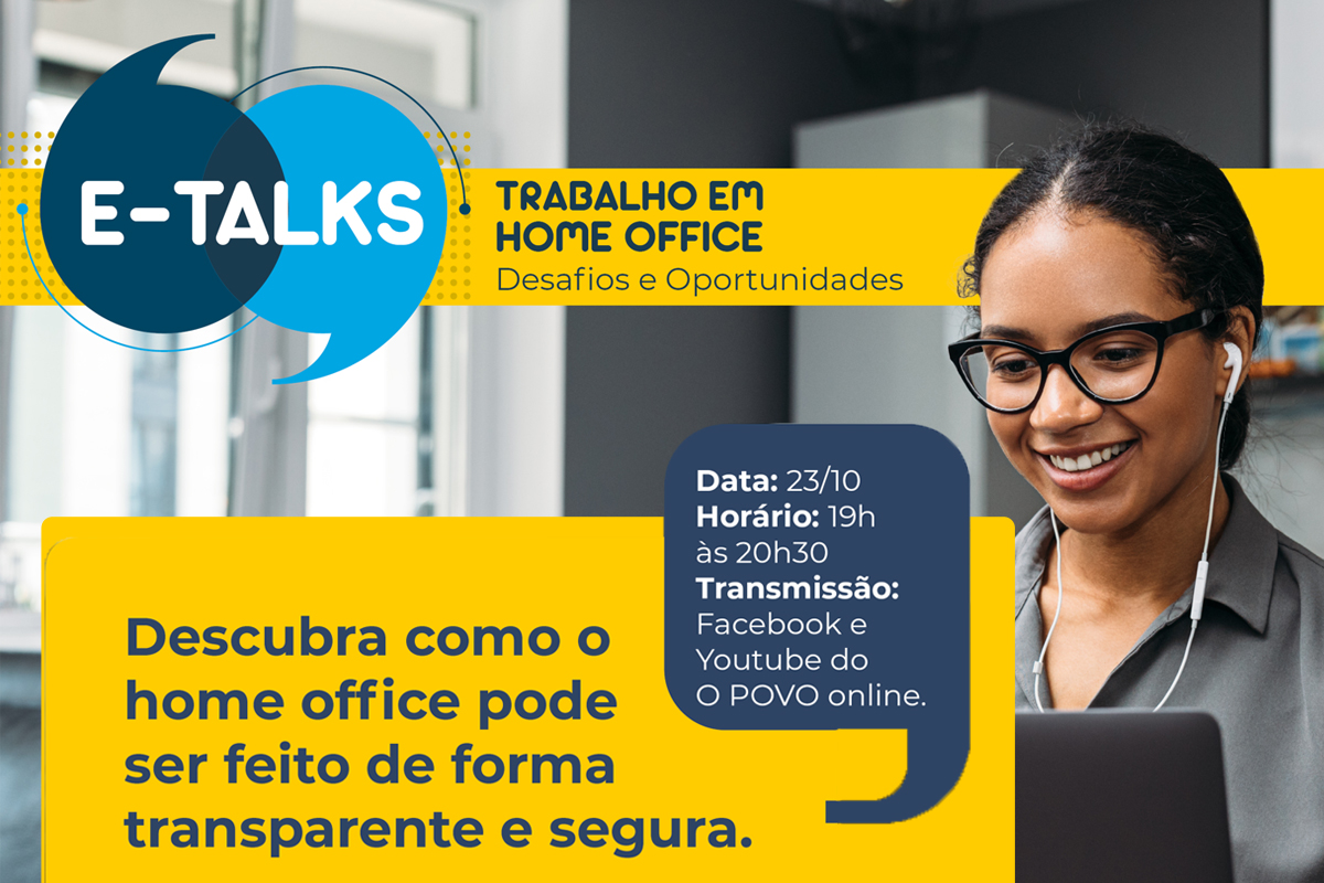 Nesta sexta-feira (23/10), às 19h, acontecerá o evento virtual "E-Talks - Trabalho em home office: desafios e oportunidades", promovido pelo Jornal O Povo em parceria com Fecomércio-CE, a Fiec e o Sebrae. A iniciativa é apoiada pelo TRT/CE e terá participação do presidente do órgão, desembargador Plauto Porto, e dos gestores regionais do Programa Trabalho Seguro, desembargador Francisco José Gomes e juiz do trabalho Carlos Rebonatto. O encontro será transmitido pelo canal no Youtube e pela página do Facebook do O Povo Online.