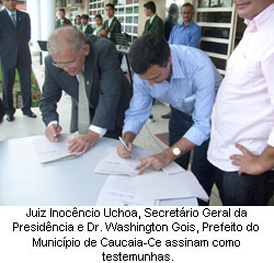 “O objetivo é um só: favorecer as partes na agilização dos processos, garantindo celeridade a partir da produção de provas periciais, podendo tornar a Justiça do Trabalho mais eficiente na prestação do serviço ao jurisdicionado”, foi o que afirmou o presidente do TRT/CE, desembargador José Antonio Parente da Silva, durante a solenidade de assinatura do acordo. Pelo Tribunal, assinou o acordo o presidente Antonio Parente e pelo Instituto de Previdência do Município de Caucaia o acordo foi assinado pelo seu presidente Hipólito Índio Guimarães Neto. O prefeito de Caucaia, Washington Góes, e o secretário geral da Presidência do TRT/CE, Inocêncio Uchoa, assinaram como testemunhas. A solenidade, ocorrida na Vara do Trabalho de Caucaia, teve ainda a participação do juiz titular da Vara, Francisco Tarcísio Guedes Lima Verde Júnior, e o do juiz substituto Mateus Miranda de Morais.