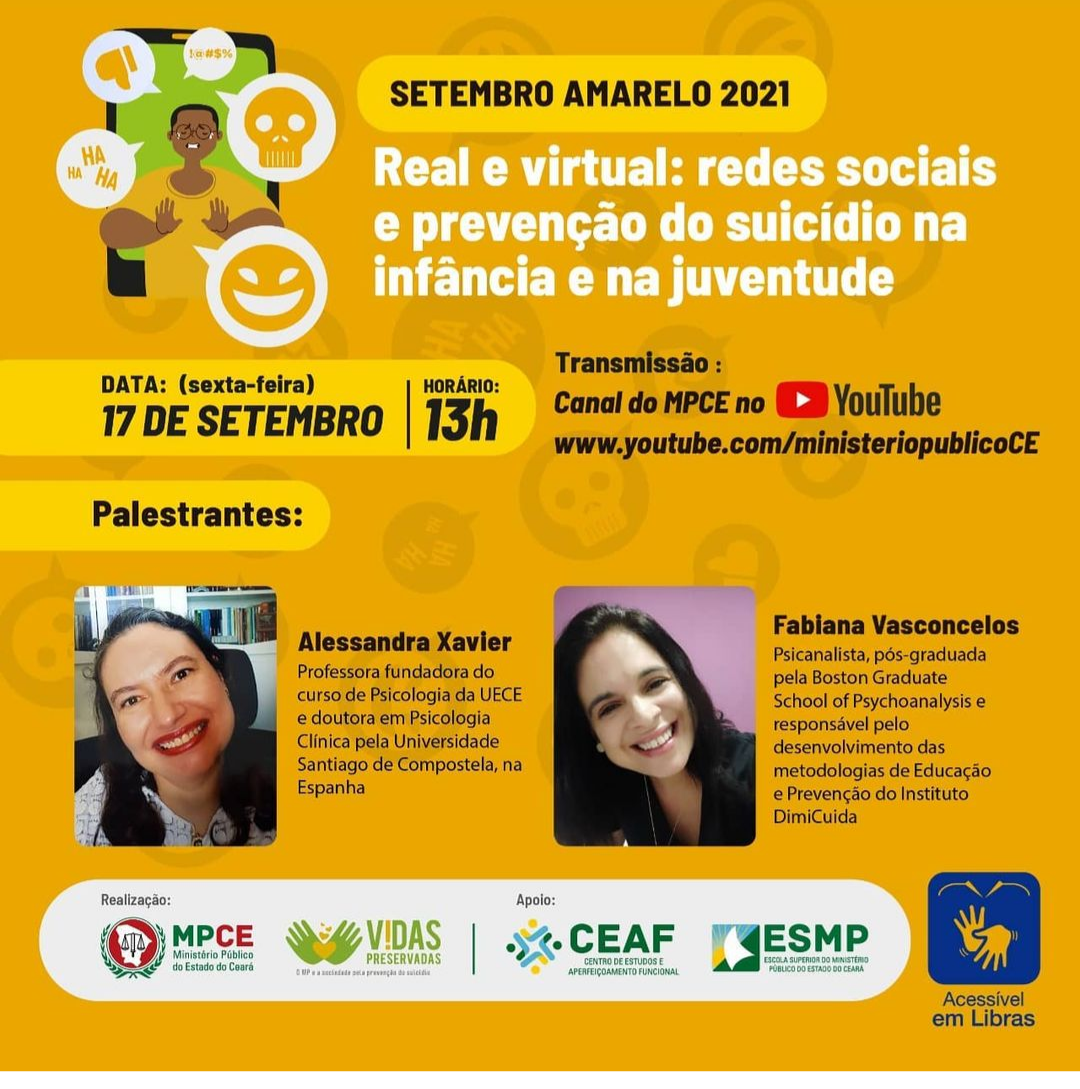 Nesta sexta-feira (17/9), o Ministério Público do Estado do Ceará (MPCE) promoverá um bate-papo sobre o tema “Real e virtual: redes sociais e prevenção do suicídio na infância e na juventude”. O encontro, que será transmitido pelo canal do MPCE no Youtube, contará com as palestrantes Alessandra Xavier, doutora em Psicologia Clínica pela Universidade de Santiago de Compostela/Espanha; e Fabiana Vasconcelos, psicanalista pós-graduada pela Boston Graduate School of Psychoanalysis.