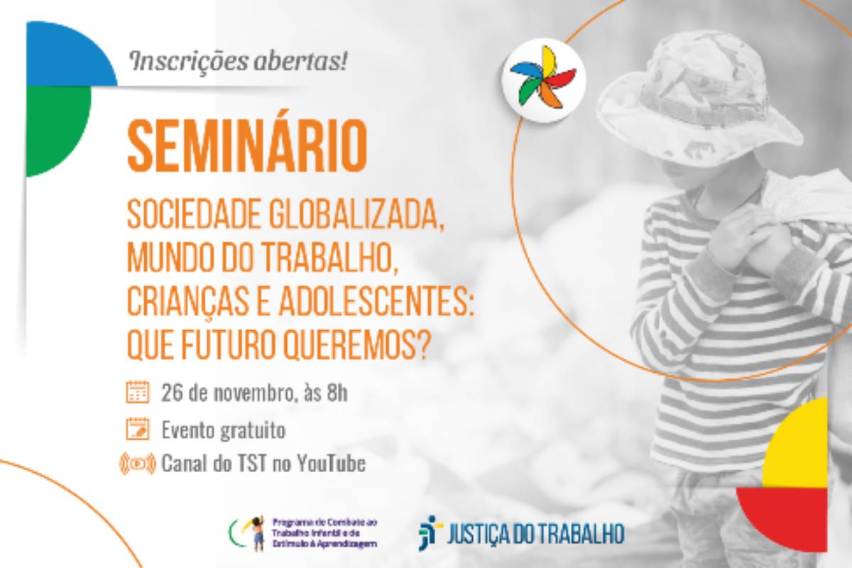O seminário “Sociedade Globalizada, Mundo do Trabalho, Crianças e Adolescentes: Que Futuro Queremos?” acontece nesta sexta-feira (26/11). O evento, promovido pelo Programa de Combate ao Trabalho Infantil e Estímulo à Aprendizagem da Justiça do Trabalho, será transmitido pelo canal do TST no Youtube.
