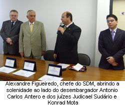 Com a presença do desembargador Antonio Carlos Chaves Antero e dos juízes trabalhistas Judicael Sudário de Pinho, diretor do Fórum Autran Nunes, e Konrad Saraiva Mota, além do chefe da Central de Mandados, oficial de justiça avaliador federal Alexandre Freire Figueiredo, e demais servidores do setor, as comemorações constaram da entrega de placas e certificados “Oficiais Destaque 2008”, que foram eleitos pelas Varas do Trabalho de Fortaleza e pelos servidores internos do SDM, pelo critério de qualidade, eficiência e zelo no cumprimento dos mandados judiciais e pelo bom relacionamento interpessoal. Foram agraciados Raimundo Vicente de Lima, Antonio Bianor Neto Pinheiro e Maria Adalmira Aguiar Arcanjo. Hoje, a Central de Mandados conta com 36 oficiais.