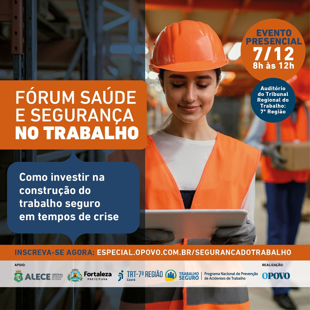 O Grupo de Comunicação O Povo e o Tribunal Regional do Trabalho da 7ª Região (TRT-7), com apoio da Assembleia Legislativa do Estado do Ceará e da Prefeitura de Fortaleza, realizam o Fórum Saúde e Segurança no Trabalho. O evento é gratuito e ocorre no dia 7 de dezembro (quarta-feira), das 8h às 12h, no auditório do TRT-7.