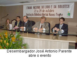 A Biblioteca Aderbal Nunes Freire, do Tribunal Regional do Trabalho do Ceará- 7ª Região, iniciou às comemorações alusivas à Semana Nacional do Livro e da Biblioteca, ontem, cuja data é festejada de 23 a 29 de outubro. A abertura oficial da programação, no auditório do 4º andar – Anexo II, foi feita pelo Desembargador José Antonio Parente da Silva, presidente do TRT/CE, que fez uma explanação sobre a importância do evento, que tem como objetivo promover festejos e comemorações de caráter cultural e popular destinados a incentivar o hábito de leitura e o desenvolvimento sociocultural do País. Em seguida, falou também sobre vários projetos em andamento e outros já sendo executados pela Biblioteca na atual gestão. Tais como: empréstimo de livros via malote para as Varas do interior; catalogação de artigos de periódicos (6.700 já catalogados); participação da Redit- Rede de Documentação e Informação da Justiça do Trabalho por meio do Siabi- Sistema de Automação que hoje é padrão na Justiça trabalhista. Vale salientar, que o TRT 7ª Região é o precursor desta rede e sua biblioteca vice-coordenadora da Redit.
