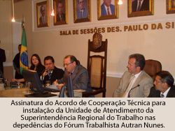 Em solenidade realizada na última quarta-feira, dia 13 de agosto, na Sala de Sessões do Pleno do Tribunal Regional do Trabalho do Ceará – 7ª Região, o presidente do TRT/CE, desembargador José Antonio Parente da Silva, e o ministro do Trabalho e Emprego, Carlos Lupi, assinaram o Acordo de Cooperação Técnica, visando à instalação de uma Unidade de Atendimento da Superintendência Regional do Trabalho do Ceará nas dependências do Fórum Autran Nunes, no Edifício Dom Helder Câmara.