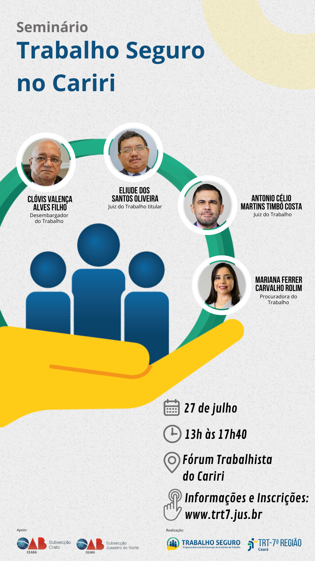 Em alusão ao Dia Nacional de Prevenção de Acidentes e Doenças do Trabalho, a gestão regional do Programa Trabalho Seguro (PTS) do Tribunal Regional do Trabalho da 7ª Região (TRT-7) promoverá, no dia 27 de julho, no Cariri (região Sul do Ceará), seminários reunindo trabalhadores, empresários, acadêmicos, advogados e demais interessados nos temas.