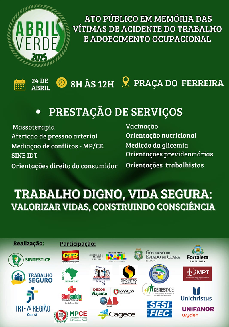 Várias instituições ligadas ao mundo do trabalho, tendo à frente o Programa Trabalho Seguro (PTS) da Justiça do Trabalho do Ceará e o Sindicato dos Técnicos em Segurança do Trabalho no Estado do Ceará, vão realizar uma manhã de prestação de serviços na Praça do Ferreira, no dia 24 de abril, a partir das 8h.