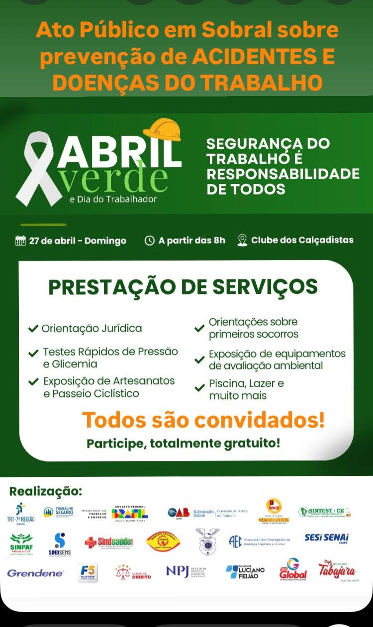 A gestão regional do Programa Trabalho Seguro (PTS), em parceria com diversas entidades públicas e privadas, realiza ato público em memória das vítimas de acidentes de trabalho em Sobral, no dia 27 de abril, a partir das 8h. A manhã de prestação de serviços acontece no Clube dos Calçadistas (Av. Mãe Rainha - Renato Parente, Sobral - CE). A iniciativa faz parte das ações do Abril Verde – mês dedicado ao combate aos acidentes de trabalho.
