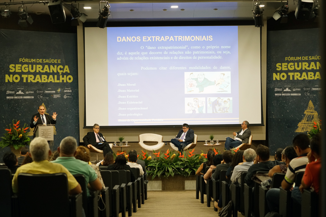 A abertura da mesa da tarde, que teve início às 14h, deu-se pela exposição do desembargador do TRT/CE e gestor regional do Programa Trabalho Seguro Franzé Gomes, palestrante do painel que discutiu os "Aspectos legais na reparação de violências sofridas no ambiente de trabalho". Em seus 40 minutos de apresentação, o magistrado pontuou os diversos tipos de danos extrapatrimoniais possíveis nos ambientes de trabalho, tratou sobre o impacto da Reforma Trabalhista (Lei 13.467/2017) frente às relações trabalhador-empregado nas questões referentes aos acidentes de trabalho e expôs os princípios da proporcionalidade e razoabilidade, pontos levados em consideração nas análises de processo trabalhistas e determinantes na assinatura do valor a ser pago em indenizações.