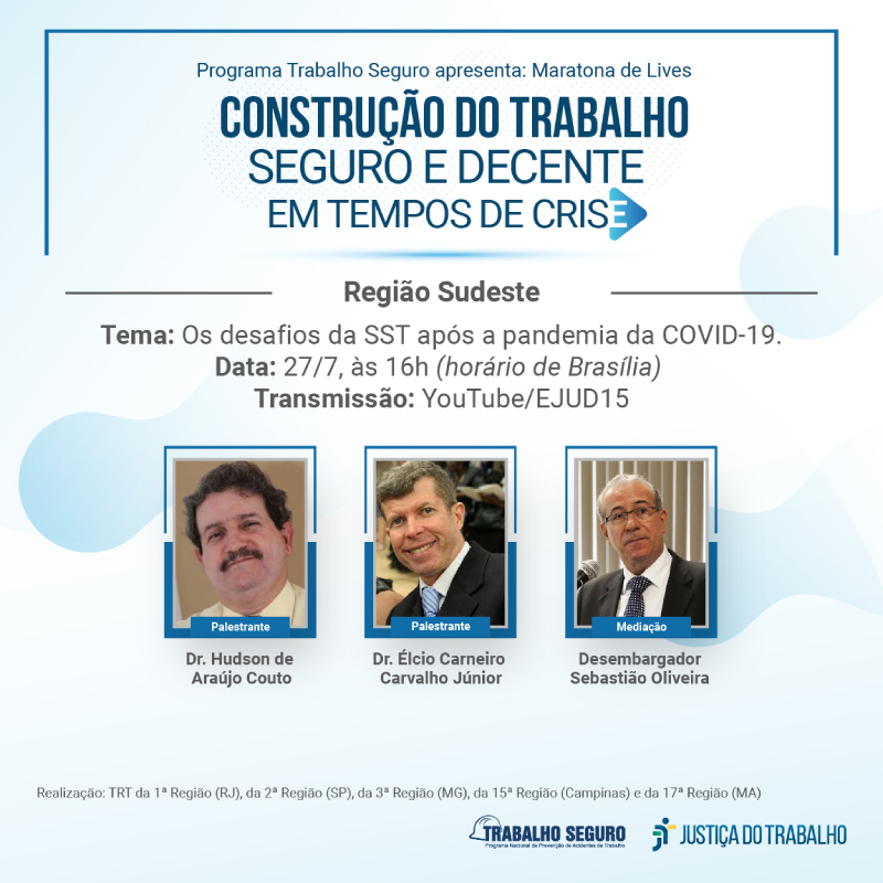 Os Tribunais Regionais do Trabalho da Região Sudeste promovem nesta segunda-feira (27/7), às 16h, a live “Os desafios da Saúde e Segurança do Trabalho (SST) após a pandemia da Covid-19”, com transmissão pelo canal do TRT da 15ª Região (Campinas) no Youtube. O evento é organizado pelos gestores regionais do Programa Trabalho Seguro no TRT15, desembargador Lorival Ferreira dos Santos e juiz Firmino Alves Lima, e será apresentado pelos palestrantes Hudson de Araújo Couto (médico do trabalho) e Élcio de Carvalho Júnior (psiquiatra), com mediação do desembargador do TRT3 (MG) Sebastião Geraldo de Oliveira, gestor nacional do programa.
