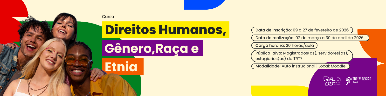A Escola Judicial do TRT da 7ª Região (EJUD7) promoverá o curso "Direitos humanos, Gênero, Raça e Etnia", no período de 02 de março a 30 de...