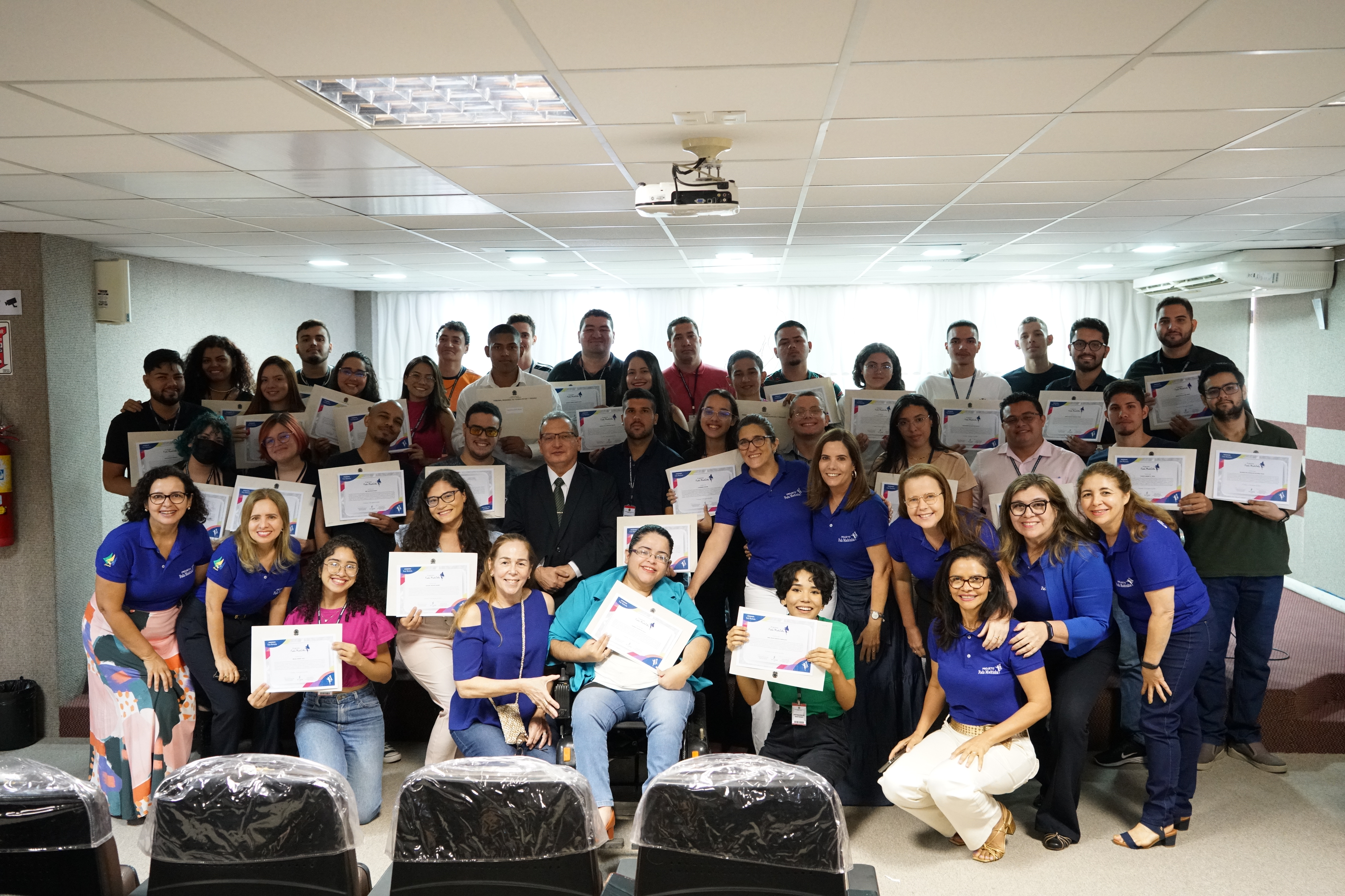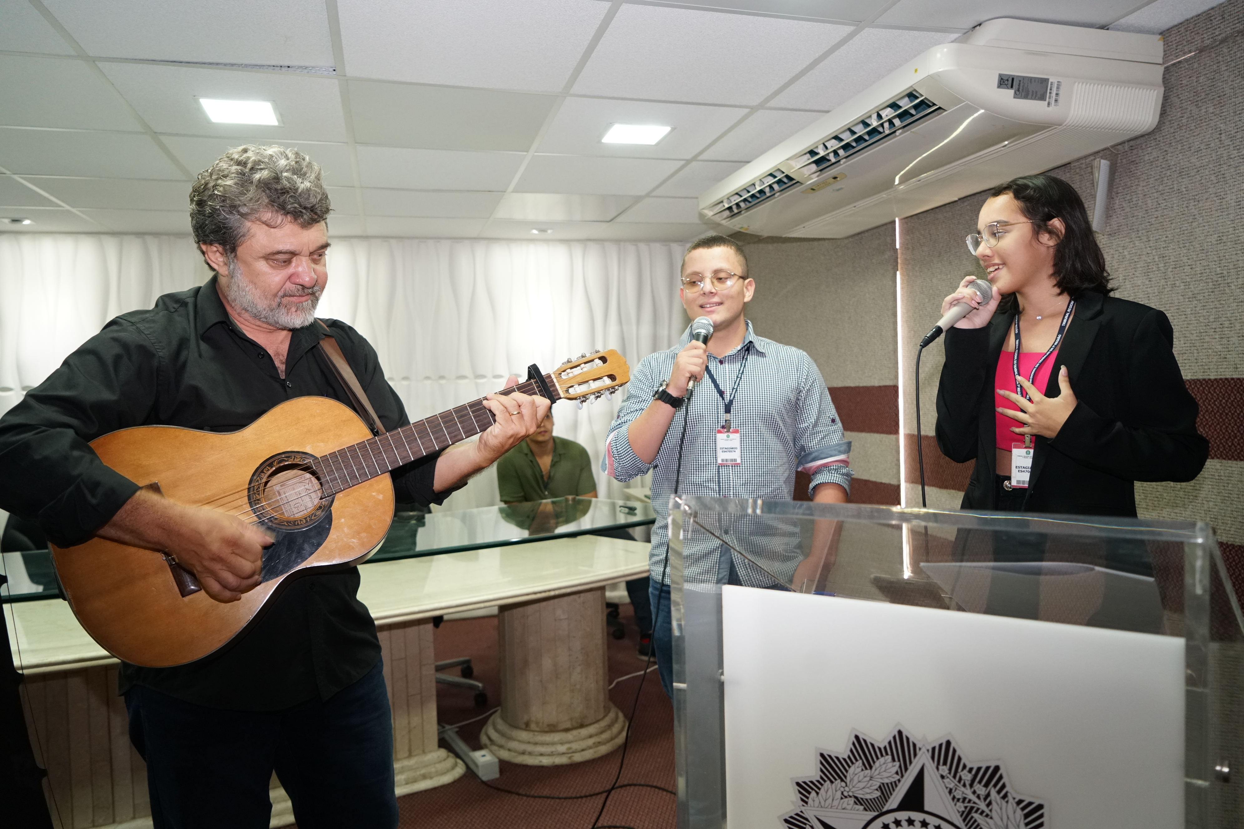 A celebração contou também com a apresentação musical dos estagiários João Gabriel Galvão, da Divisão de Material e Logística, e Lavingnia Maciel, da Coordenadoria de Segurança e Transporte, acompanhados do músico Gonzaga Leite. João Gabriel também foi um dos concludentes desta edição do Programa Fada Madrinha. “Foi uma experiência inovadora, as oficinas foram bem eficientes, é uma base para nos desenvolver como profissionais. Um dos módulos do projeto foi sobre saúde mental, uma temática profissional, mas também interpessoal, então é muito bom termos essa abordagem”, avaliou o estagiário.