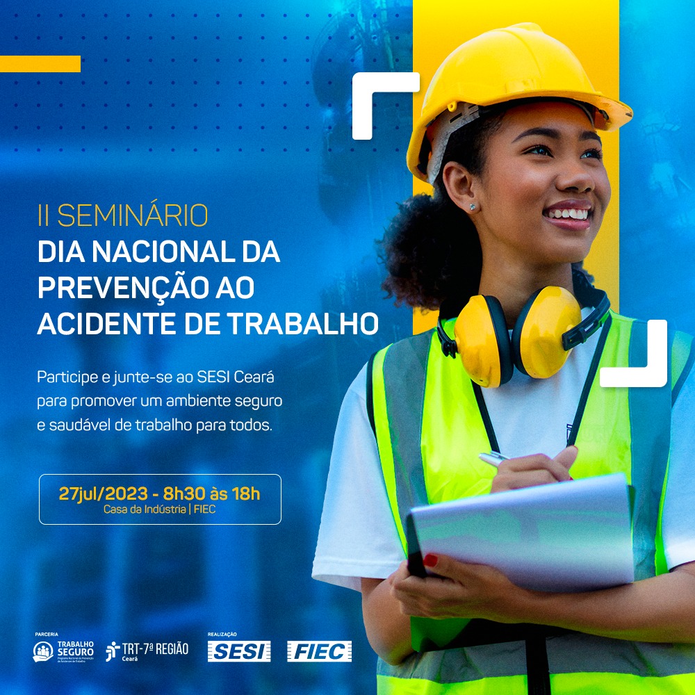 No próximo dia 27 de julho (quinta-feira), de 8h30 às 18h, o SESI Ceará realiza o II Seminário Dia Nacional de Prevenção de Acidentes de Trabalho, com debates, reflexões e apresentações de iniciativas sobre este tema que tem alta relevância para a sociedade. O evento conta com a participação do Tribunal Regional do Trabalho (TRT-7), do Ministério Público do Trabalho (MPT-7), da Superintendência Regional do Trabalho e Emprego (SRTE/CE), além de representantes de indústrias e empresas que atuam no Ceará, e de profissionais do SESI.